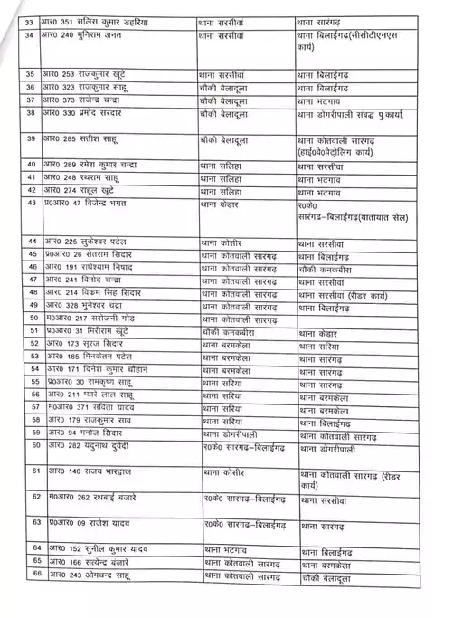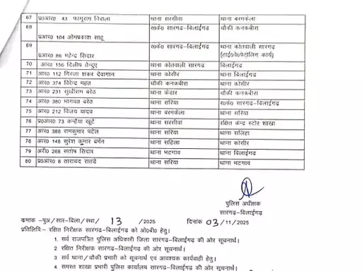 सारंगढ़-बिलाईगढ़। जिले में पुलिस विभाग के भीतर बड़ा प्रशासनिक फेरबदल किया गया है। पुलिस अधीक्षक कार्यालय से जारी आदेश के अनुसार कुल 80 पुलिसकर्मियों का तबादला किया गया है। इनमें 16 प्रधान आरक्षक, 64 आरक्षक और महिला आरक्षक शामिल हैं।