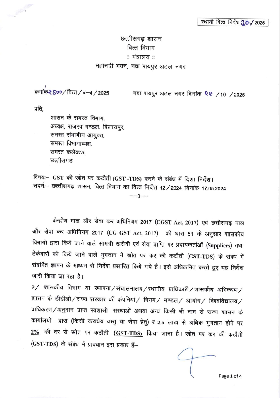 रायपुर, 29 अक्टूबर।जीएसटी कटौती को लेकर वित्त विभाग ने सभी सरकारी विभागों को पत्र जारी किया है। निर्देशों के अनुसार, किसी भी विभागीय खरीदी यदि 2.50 लाख रुपये से अधिक की है, तो उस पर जीएसटी की काट कर भुगतान करना अनिवार्य होगा।