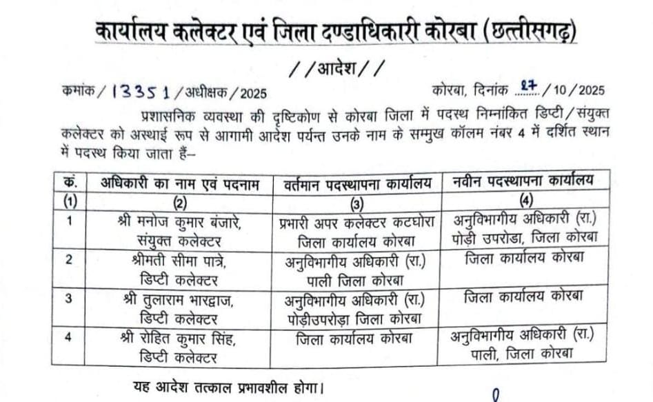 छत्तीसगढ़ SDM ट्रांसफर: कोरबा जिले में चार एसडीएम का तबादला, देखें नई पदस्थापना सूची।